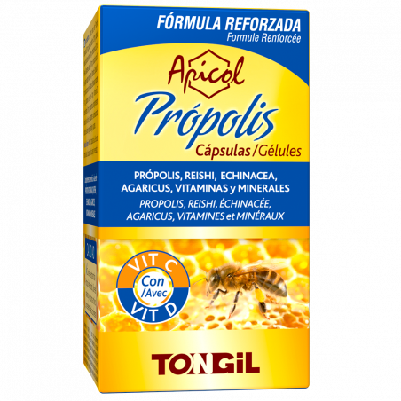 Própolis depurado, libre de resinas y restos no activos procedentes de la colmena y estandarizado al 12% en flavonoides, presentado en un cómodo formato de cápsulas vegetales. Fórmula reforzada, ahora APTA PARA VEGETARIANOS. La fórmula se refuerza con extractos secos altamente concentrados de ingredientes que favorecen al sistema inmunitario: Echinacea purpurea y los hongos Reishi y Agaricus (Champiñón del Sol) y con vitaminas y minerales: - Extracto de Reishi (Ganoderma lucidum) 20 veces concentrado y extracto de Agaricus (Agaricus blazei Murril) 8 veces concentrado - Vitaminas: Vitamina C no ácida (no resulta irritante para el sistema digestivo). Vitamina D3 (aportada en su forma activa colecalciferol) y vitamina E. - Minerales: Cobre y Hierro, que favorecen al sistema inmunitario.